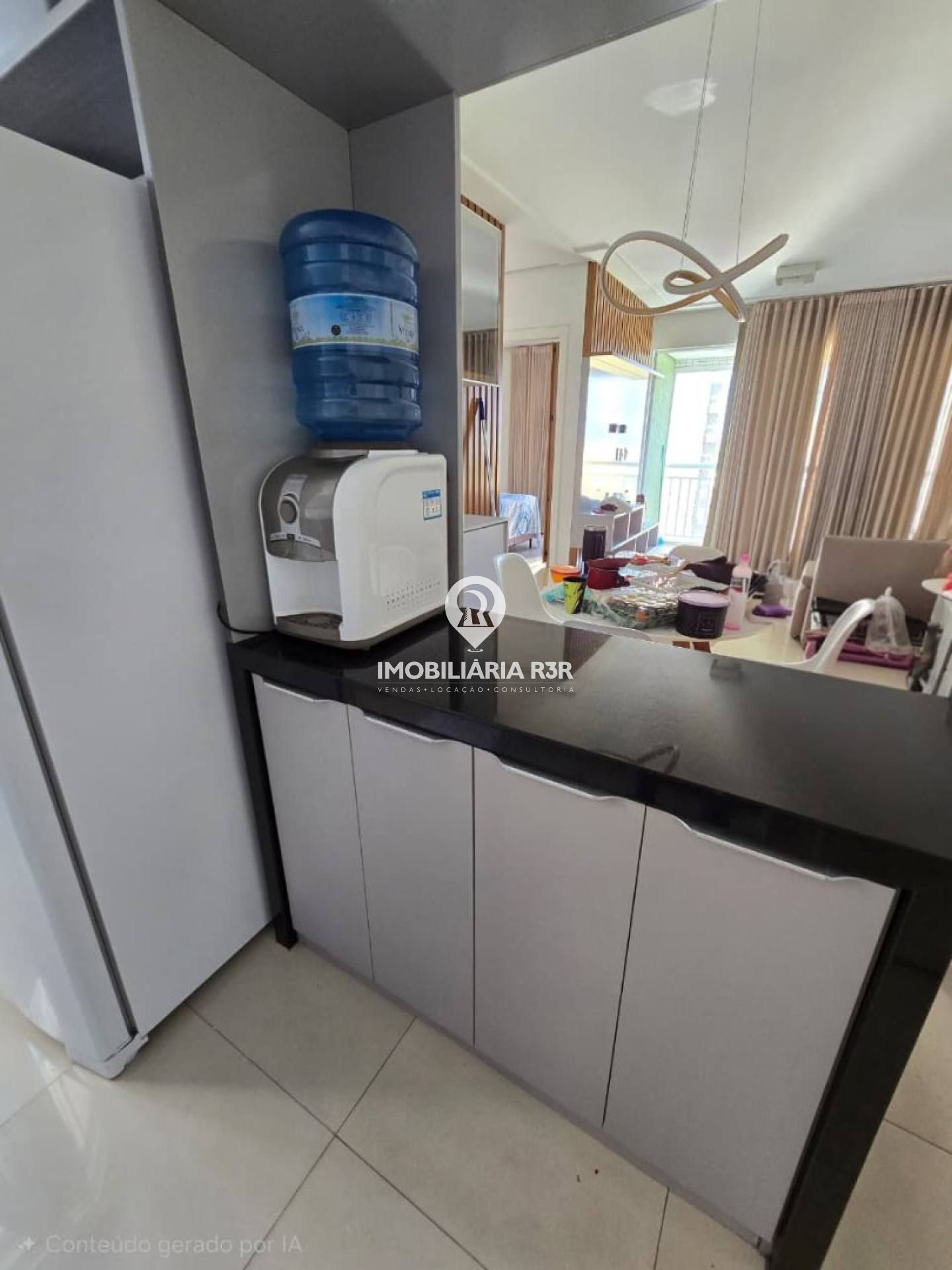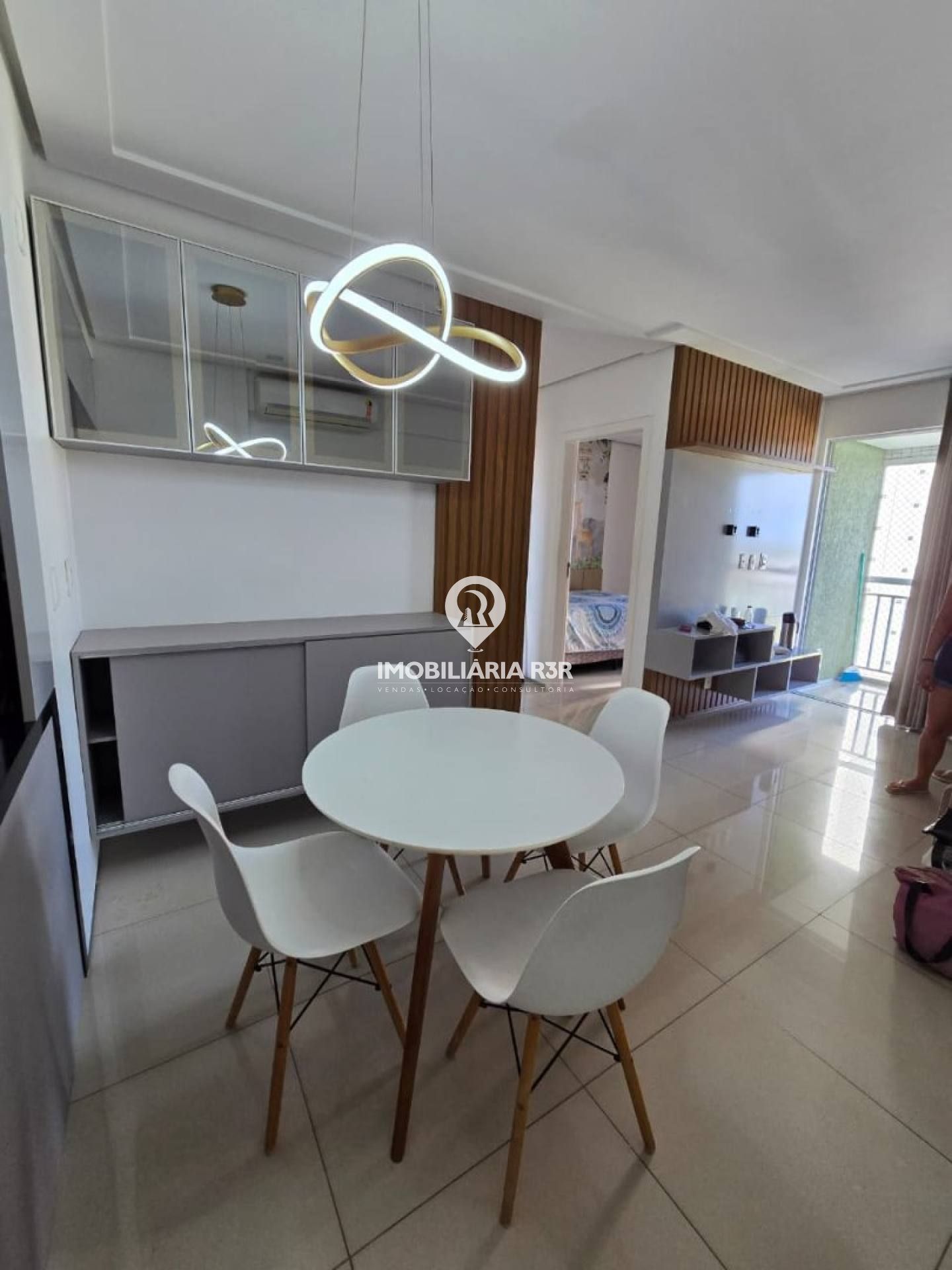 • Sala com: Sofá, Painel para TV,1 Split, Mesa com cadeira, Luminária, cortina e armário